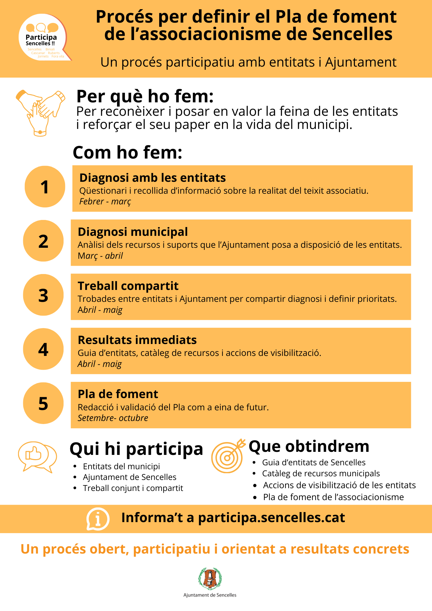El procés es basa en la participació directa de les entitats de Sencelles i inclou una fase de diagnosi, espais de treball compartit entre entitats i Ajuntament, i l’elaboració de resultats concrets com una guia d’entitats i un catàleg de recursos municipals.