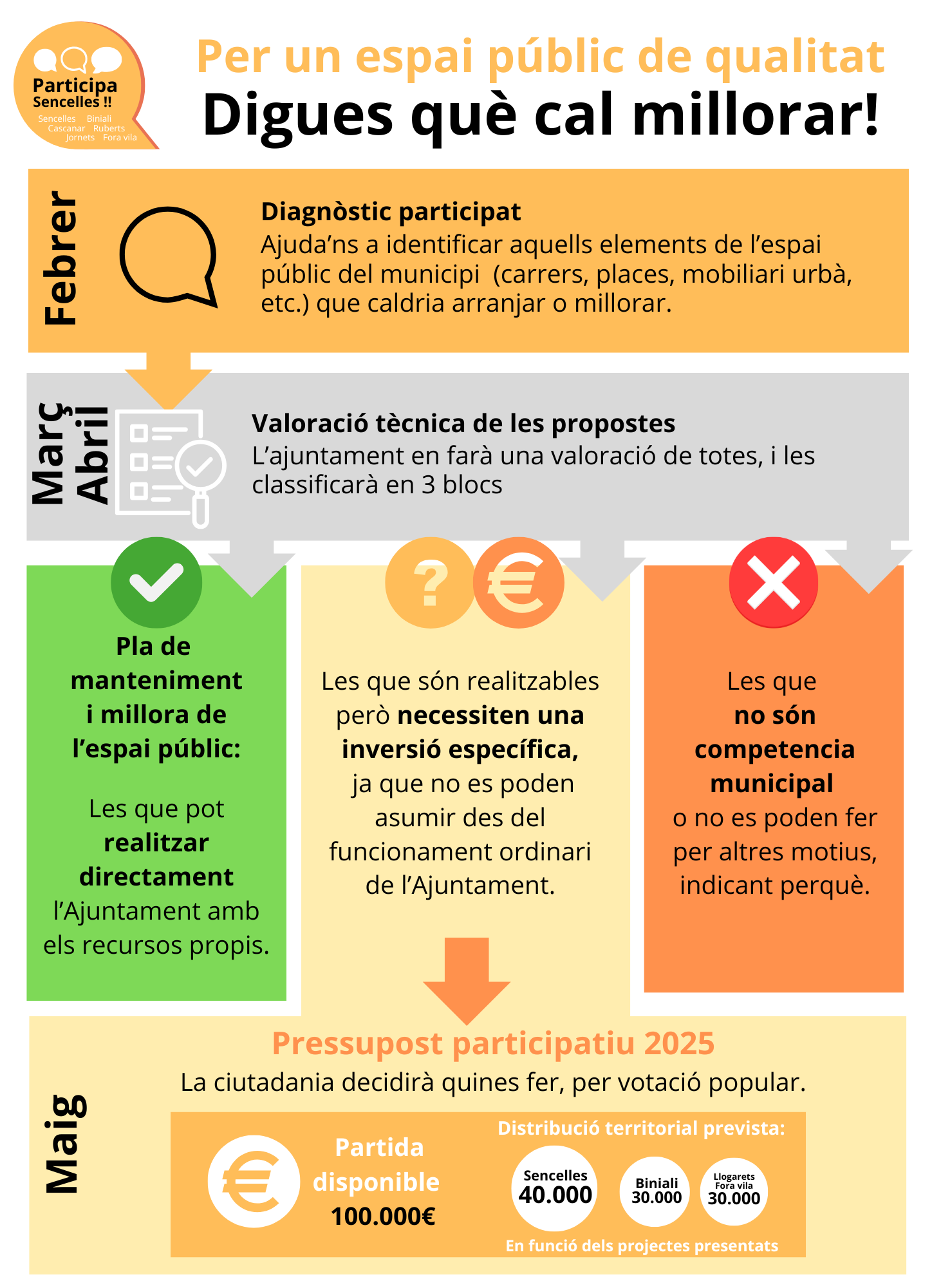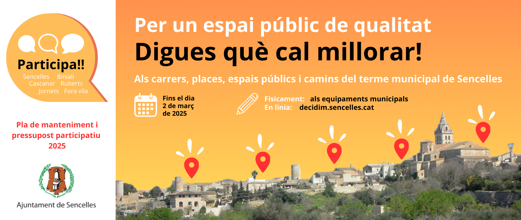 Este año 2025 el Ayuntamiento de Sencelles quiere recuperar los presupuestos participativos, que ya se habían realizado desde 2017 a 2020, pero planteando una serie de mejoras. En esta edición, el ámbito de actuación será el mantenimiento y la mejora del espacio público.